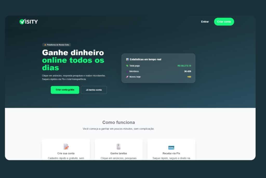 Um desses sites é o Visity, um PTC brasileiro que permite que qualquer pessoa ganhe dinheiro online diretamente de casa, usando apenas um celular ou computador com acesso à internet. O Visity reúne diversas formas de ganhos em um único lugar, com pagamentos rápidos via PIX, saque mínimo extremamente baixo e uma proposta simples de entender, mesmo para iniciantes.